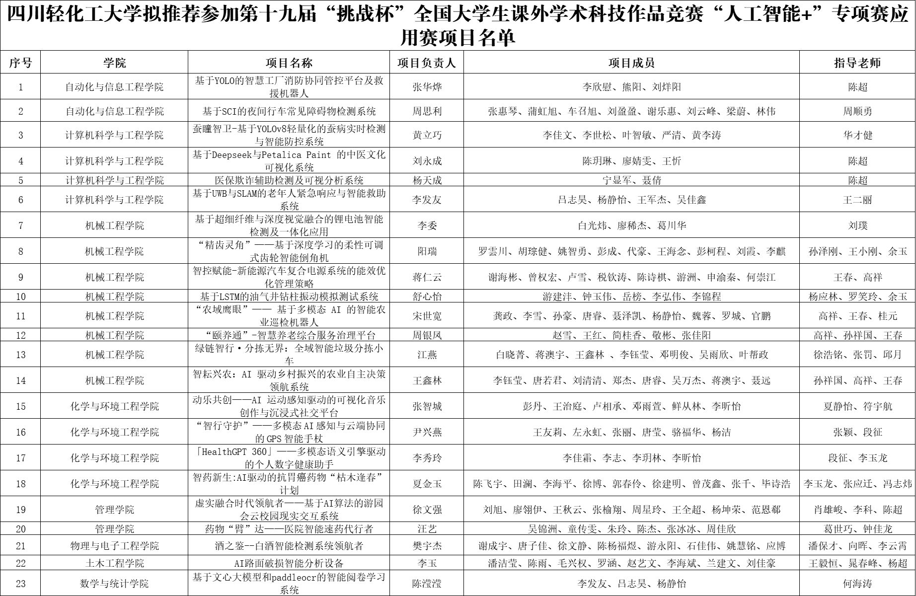 经资格审查、文本初审,拟推荐以下29件作品参加第十九届“挑战杯”全国大学生课外学术科技作品竞赛人工智能+专项赛(应用赛、创意赛),名单详见附件。公示期为2025年7月6日至2025年7月10日。