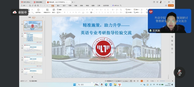 2026325日晚上19:00,外语学院召开“十五五”规划研讨暨教研室主任经验交流会,学院领导、各教研室主任、学科办全体成员齐聚云端,围绕学科建设、教学改革与人才培养核心任务,共谋学院十五五高质量发展新篇章。会议由副院长吴春容主持