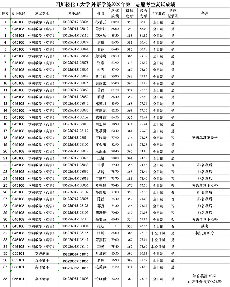 根据教育部、四川省及《四川轻化工大学2026年硕士研究生招生复试录取办法》等相关文件精神,本学院坚持综合评价、择优录取,确保公平、公正、科学,严格、规范地组织了2026年硕士研究生复试录取工作。第一志愿考生已复试完毕,经复核无误后,现将复试成绩予以公布(详见附表)。