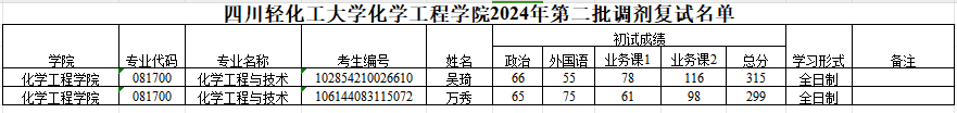 四川轻化工大学化学工程学院2024年第二批调剂复试名单