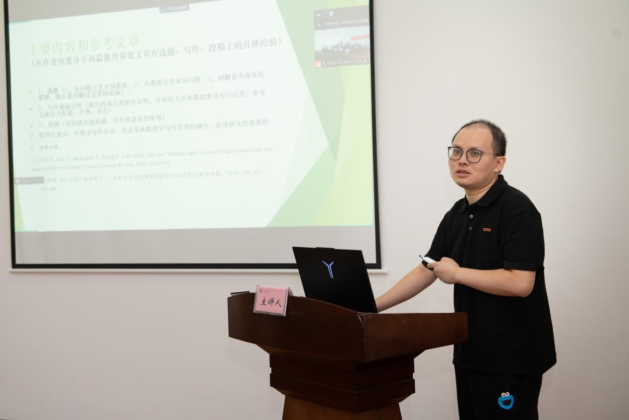 顾祥做了“教育量化研究的探讨”主题分享。他结合自身的研究成果,强调了选题在教育量化研究中的核心地位。他提出,成功的选题应遵循三大原则:一是从实际问题出发,通过数据分析寻找解决方案;二是从数据中挖掘潜在的研究问题;三是确保所选问题的真实性与重要性。在论文写作阶段,顾祥强调论据的重要性,倡导每一个论点都需有详实的数据支撑,以确保论证严谨有力。此外,他还分享了国际期刊投稿实战经验,特别指出中英文写作需注意的细节差异,为管院研究生们提供了宝贵的学术指导。