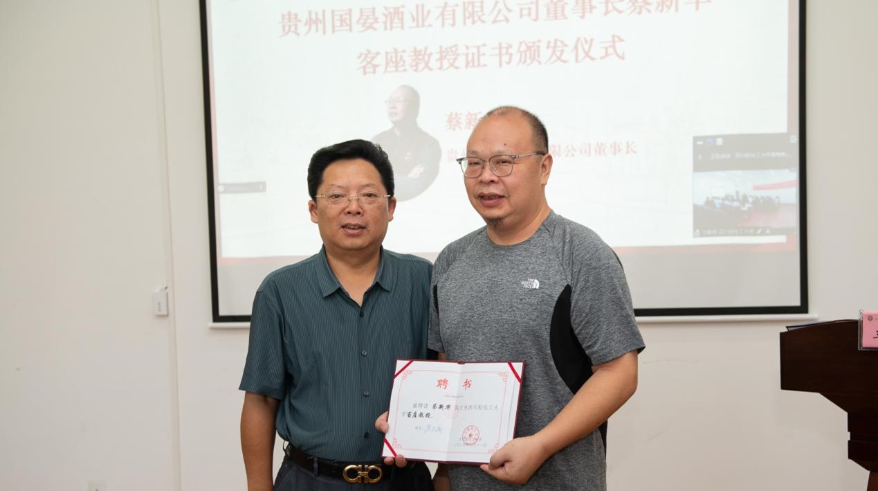 此外,为进一步深化校企合作,促进产学研深度融合,加速科技成果向现实生产力转化,高小林为贵州国晏酒业有限公司董事长蔡新华先生颁发了客座教授聘书,并表示希望未来能有更多像蔡新华先生这样的优秀企业家与四川轻化工大学携手并进,共同探索学术研究与产业发展新路径,为提升新质生产力,助推中国式现代化进程,服务中华民族伟大复兴贡献智慧和力量。