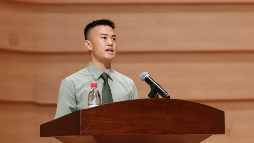 在校生代表段茂辉在发言中分享了自己成功申请并融入“军事爱好者学会”的历程。寄语2024级新生们:在追梦的路上,坚守初心与梦想是通往成功的坚实基石。同时,他鼓励大家倾听内心的声音,保持自律与自强,勇往直前,让梦想照进现实。