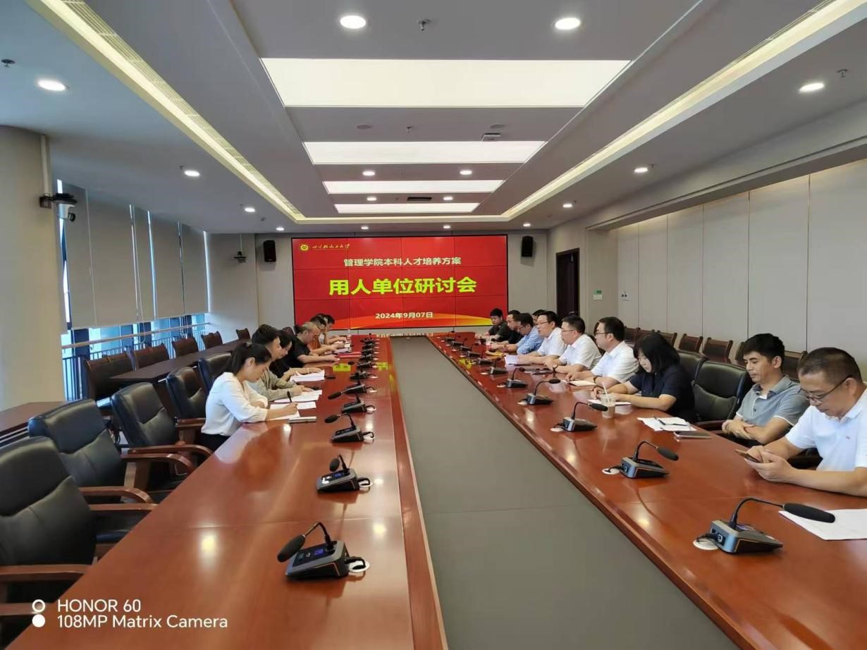 2024年9月7日上午9点,管理学院本科人才培养方案用人单位研讨会在李白河校区行政中心9楼9-1会议室召开。四川华信(集团)会计师事务所的特殊普通合伙人赵勇军、宜宾三江汇海科技集团有限公司会计部副部长刘敏、四川蜀旺新能源股份有限公司常务副总经理雷金良、渝建实业集团股份有限公司项目经理黎在勇、成都朵米亚电子商务有限公司联合创始人粟茂倚、四川恒德致远企业管理有限公司商务总监及管理学院成都校友会秘书长宋勤慧、宜宾蓝鲸文化传媒有限公司总经理刘远帆等用人单位负责人、高管出席本次座谈会。研讨会由管理学院副院长熊山主持,管理学院党委副书记韦崇岗、李科,副院长余元春以及各系主任参与本次会议。