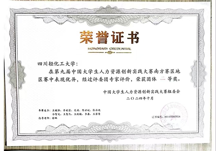 管理学院人力资源管理专业的王镜骄、王若倩、李鑫、冷智文、陈世姣、王跃翰、吴涛、李韵萱、王智杰、张冰滟十名同学在徐琳老师的指导下参加南方赛区比赛。在比赛中,参赛选手的专业技能、语言表达能力、人际沟通能力、数字化人力资源管理能力得到评委的高度认可,经过激烈的竞争,我校参赛选手在地区赛无领导小组讨论赛道获特等奖,劳动争议处理赛道获一等奖,数字HR实操、实务设计、案例分析和职场实战四赛道均获二等奖,并获得学校团体二等奖,徐琳老师获得“最佳参赛组织者”和“优秀指导老师”称号。