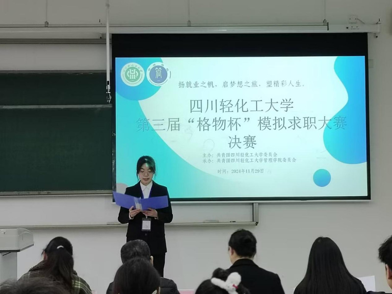 由四川轻化工大学校团委主办,管理学院承办的“格物杯”模拟招聘大赛于11 月 29 日在宜宾校区LA4 - 205 精彩上演。管理学院原党委副书记、纪委书记王令权,管理学院学工办副主任周纪容,校团委李晓兰等5名教师出席决赛并担任评委。本次大赛由陈一佳主持,旨在为学生提供实战求职演练平台,提升就业竞争力。