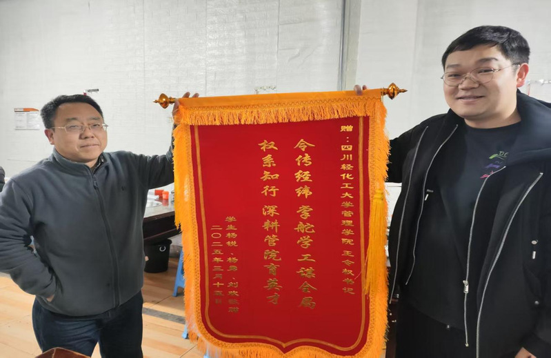 2025年3月15日下午,四川轻化工大学管理学院原党委副书记、纪委书记王令权在荣休之际收到了一份特殊的礼物——2023届毕业生杨锐、杨勇、刘欢三人精心制作的一面锦旗。锦旗上“令传经纬,掌舵学工谋全局;权系知行,深耕管院育英才”的赞语,既凝结着学子对恩师多年教诲的感激之情,也见证了一位教育工作者三十余载的奉献与坚守。