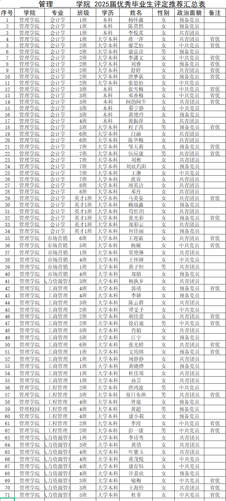 根据《关于开展2025届优秀毕业生评选工作的通知》和《四川轻化工大学“优秀毕业生”评定办法》(川轻化〔2020〕1 号)有关规定,经过学生自荐、学院公开评选,现将2025届四川轻化工大学优秀毕业生拟推荐人选名单公示如下: