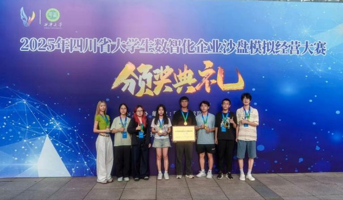 2025四川省大学生数智化企业沙盘模拟经营大赛于2025年7月4-5日在西华大学圆满举办。在这场由四川省教育厅主办,西华大学承办,新道科技提供技术支持的赛事中,由我校管理学院王宇柔、李明红、马召雅、李雨欣、李鑫、赵叙泽、陈怡圩、李昊燃八位同学组成的“碳索者”团队,经过激烈角逐,从全省46所高校的87支队伍中脱颖而出,斩获该项大赛一等奖。
