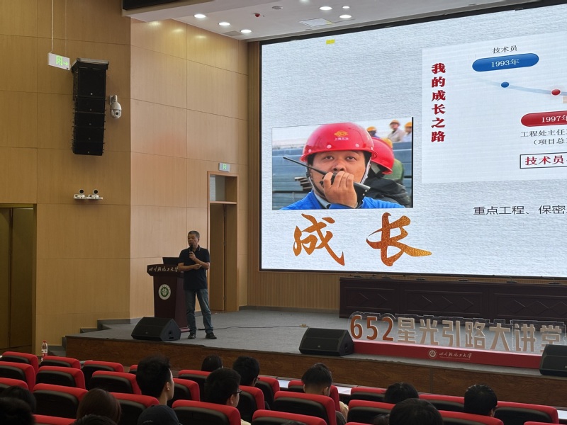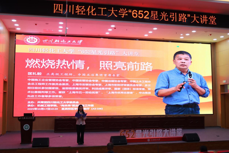 2025年10月17日,在喜迎建校60周年之际,四川轻化工大学第五期“652星光引路”大讲堂在宜宾校区学术报告厅A3-108成功举办。本次活动特邀机械工程学院化工设备与机械专业1989级1班杰出校友、中国五冶集团首席专家、正高级工程师匡礼毅担任主讲嘉宾。他以一个学长的身份,以“燃烧热情,照亮前路”为主题,与现场师生分享了从大学生成长为行业领军人物的职业历程与人生感悟。