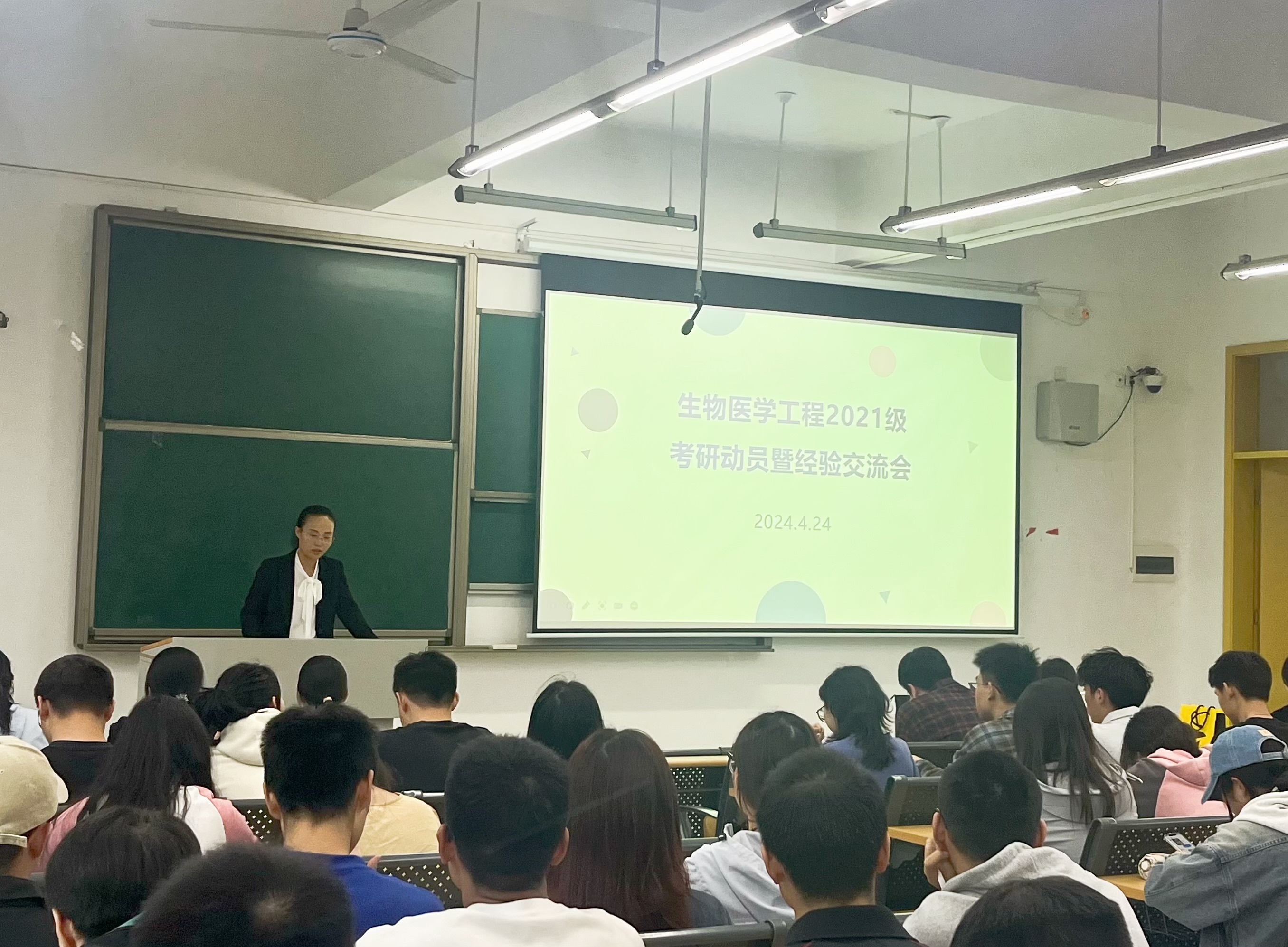 为有效提升学生考研率和升学质量,着力引导学生正确认识考研形势,调整备考心态、合理安排学习时间,2024年4月24日晚上19:00,学院在宜宾校区LA5-333举办生物医学工程专业2021级考研动员暨经验交流会。本次会议由院长助理、智能科学系主任丁菊容副教授主持,特邀生物医学工程教研室主任杜玲艳副教授和生物医学工程2020级张蕾、赵文杰、刘虹琴、罗悦鸣、沈于杰、刘盈盈六位考研上岸同学为2021级同学分享考研经验,生物医学工程2021级全体学生参会。