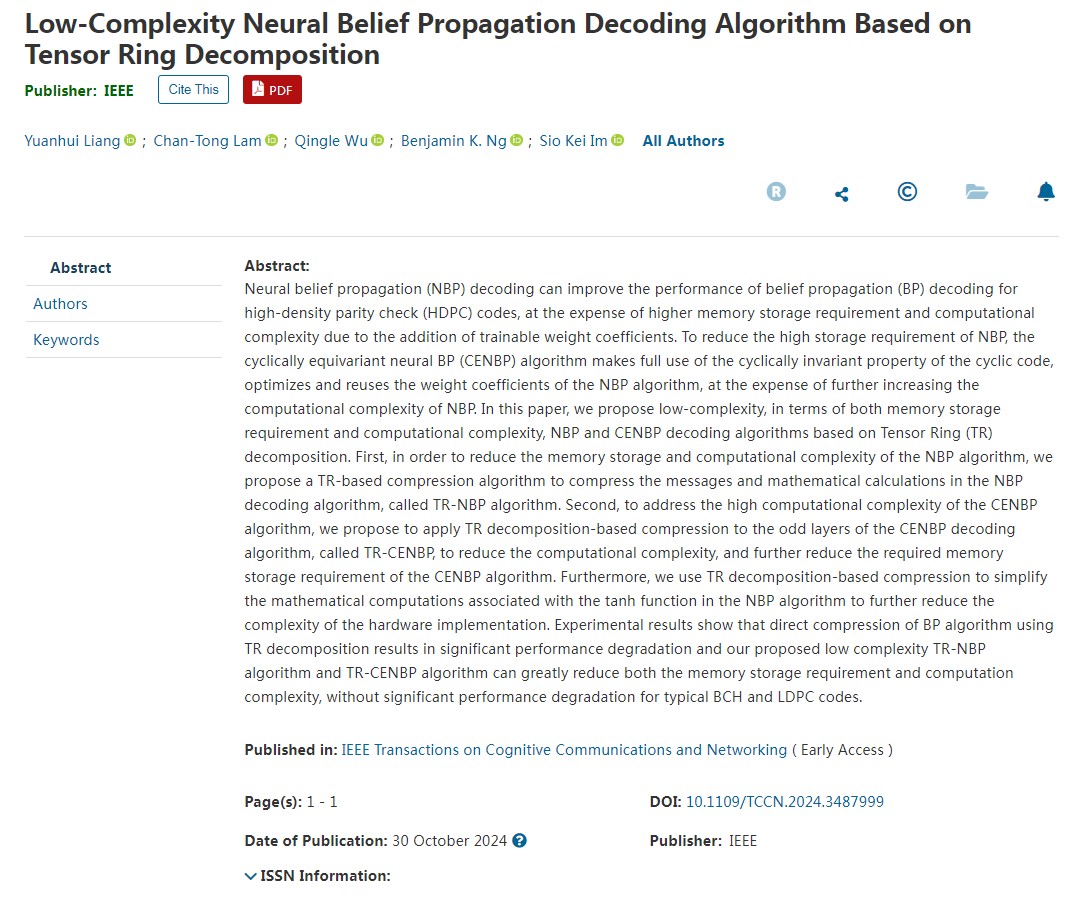 近日,我院青年教师梁元辉博士在信息通信领域国际权威期刊《IEEE Transactions on Cognitive Communications and Networking》(中科院一区,IF=7.4)上发表了题为“Low-Complexity Neural Belief Propagation Decoding Algorithm Based on Tensor Ring Decomposition”的研究论文,论文的第一作者为梁元辉老师。