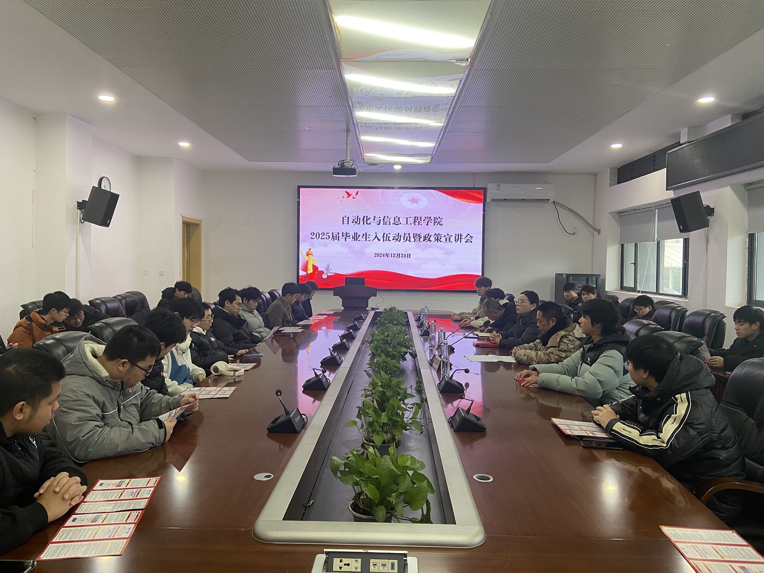 为响应党和国家号召,全面贯彻落实习近平总书记新时代强国强军思想,加强大学生征兵入伍宣传工作,引导2025届毕业生积极应征入伍,自动化与信息工程学院于12月24日在宜宾校区A8-409举办了入伍动员会暨入伍政策宣讲会。学院党委书记张艳、党委副书记、纪委书记雷崇华、学工办负责人申雪老师,学校 武装保卫部唐宁老师,以及两位退役学生代表肖雨婷、杨宝和2025届毕业生参加了会议。