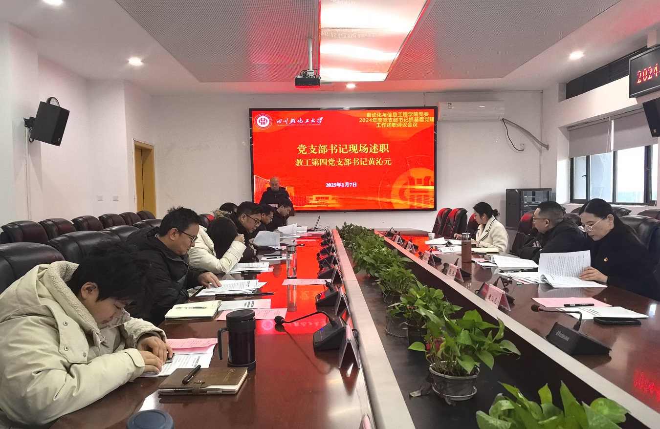 根据学校党委《关于开展2024年度学校基层党组织书记抓基层党建工作述职评议考核的通知》要求,深入学习贯彻习近平新时代中国特色社会主义思想和习近平总书记关于党的建设的重要思想,坚持和加强党的全面领导,推动党纪学习教育常态化长效化,自动化与信息工程学院党委于2024年1月7日在宜宾校区A8-409会议室召开了2024年度党支部书记抓基层党建工作述职评议考核大会。会议由学院党委书记张艳主持,学校学生资助管理中心主任刘浩宇、人事处人事调配科科长郭丽以及学院党委委员、纪委委员、各党支部书记和党员代表参加。