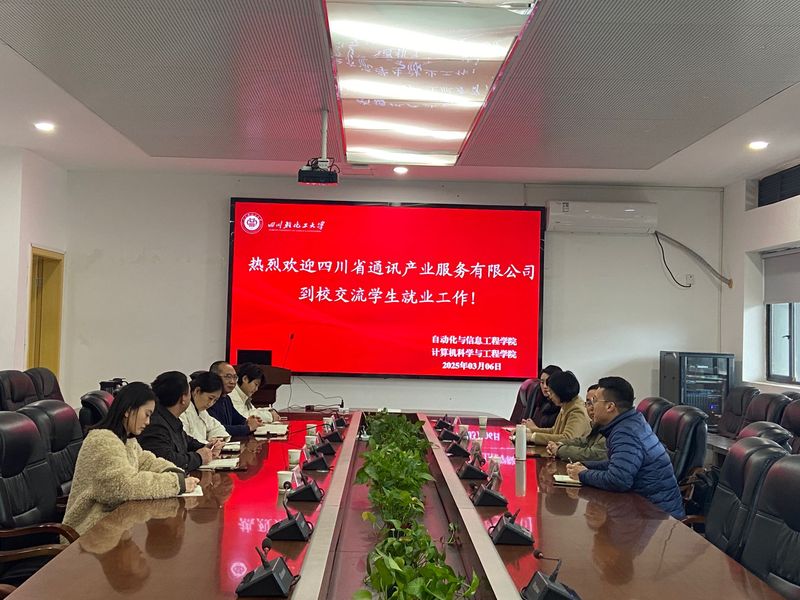 2025年3月7日,四川省通讯产业服务有限公司(以下简称“通服公司”)一行到访我校自动化与信息工程学院、计算机科学与工程学院,就深化校企合作、推进毕业生高质量就业等议题进行交流座谈。自信学院党委副书记雷崇华、计算机学院党委副书记刘红梅、自信学院学工办负责人申雪以及计算机学院李永江、朱银先老师共同参与交流。