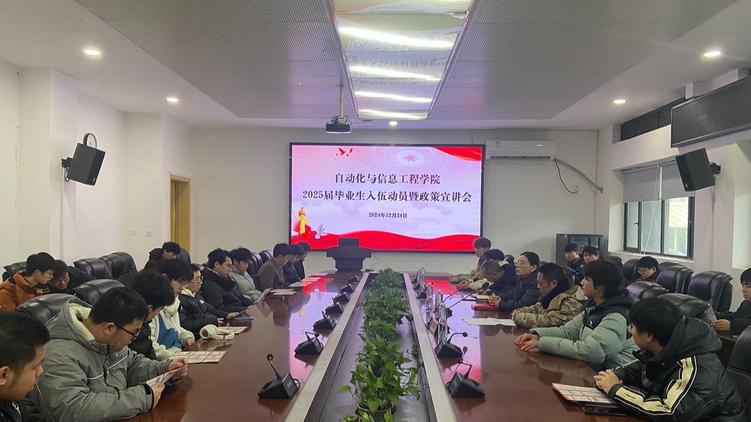为响应党和国家号召,全面贯彻落实习近平总书记新时代强国强军思想,加强大学生征兵入伍宣传工作,引导2025届毕业生积极应征入伍,自动化与信息工程学院于12月24日在宜宾校区A8-409举办了入伍动员会暨入伍政策宣讲会。学院党委书记张艳、党委副书记、纪委书记雷崇华、学工办负责人申雪老师,学校 武装保卫部唐宁老师,以及两位退役学生代表肖雨婷、杨宝和2025届毕业生参加了会议。