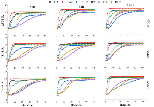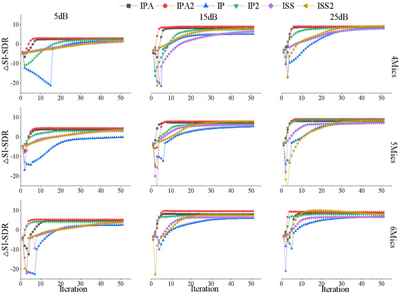 该研究旨在更有效地实现多路语音信号的盲分离,提出了一种基于辅助函数的独立向量分析(AuxIVA)联合成对更新的声源盲分离新算法。在多源分离时,该算法优于AuxIVA-IPA (iterative projection with adjustment)算法。本算法的机制在于,通过对IPA进行扩展,联合执行IP2和ISS2进行更新,可以在每次迭代中更新分离矩阵的两行两列。据此,该方法被命名为IPA2,该算法还能在保持与IPA算法相同的时间复杂度的前提下,优化与IPA算法相同的代价函数。通过卷积语音分离实验验证了所提方法的有效性和高效性。实验结果证实,与AuxIVA中使用的最先进的IP、IP2、ISS、ISS2和IPA方法相比,IPA2方法具有更快的收敛速度。