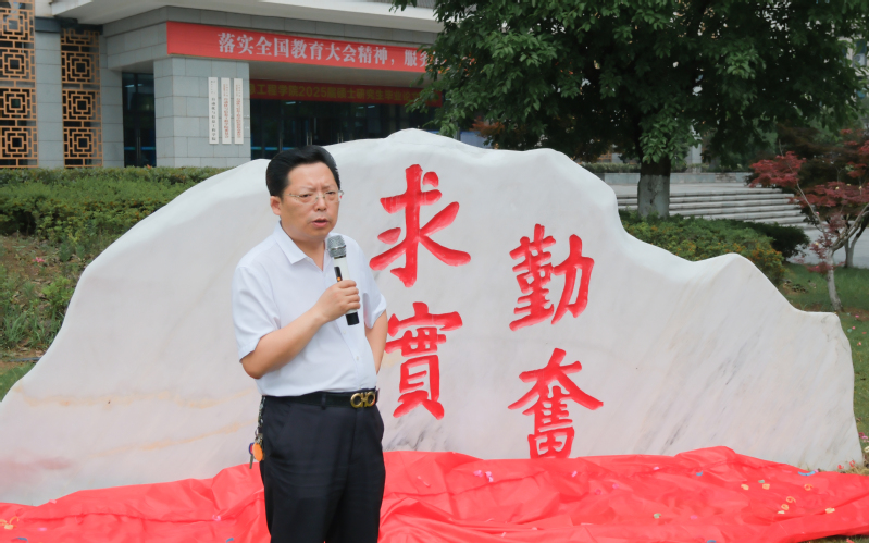 高小林副校长在讲话中高度赞扬了校友们的盛情捐赠,指出这不仅彰显了川轻化人铭记初心、永葆精神的基因与血脉, “勤奋求实”四字也是学校发展历程的生动写照。他强调,校友们团结互助、共同进步的情谊,正是“同学情”和“校友发展好”的最佳例证。并寄语在场同学:文化石是“自信人”梦想启航的原点。“实”在提醒:不要因为走得太远而忘记了为何而来;“勤”在诉说:所有惊艳时代的突破,都始于笨拙的坚持。同时,鼓励同学们以优秀校友为榜样,勤奋学习,并热情欢迎各位校友参加学校60周年校庆。