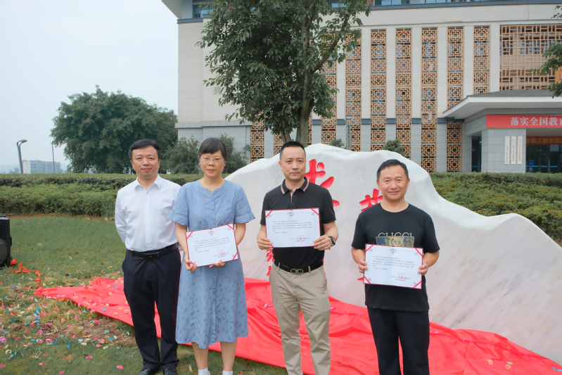 在热烈的掌声中,副校长高小林、自信学院党委书记张艳、院长曹立佳与校友代表共同为文化石揭幕。随后,校友总会秘书长何俊材向校友代表颁发了捐赠证书。