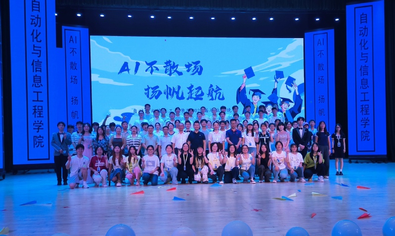6月8日晚,自动化与信息工程学院在宜宾校区科学会堂隆重举行了2025届毕业生晚会,主题为“AI不散场,扬帆起航”。学院班子全体成员与2025届毕业生齐聚一堂,共同见证这一难忘时刻。