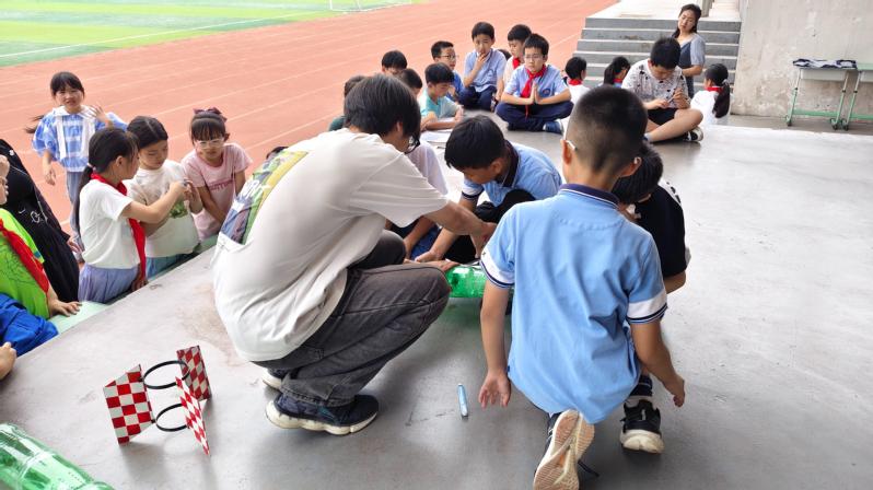 当水火箭制作完成,小朋友们期待已久的发射环节终于到来。协会成员耐心解释着水火箭的原理:在水火箭中装入适量的水后,将其固定在发射台上并充气。利用内部的气压差,箭体中的水会从喷嘴处高速喷出,产生强大的反冲力,从而推动水火箭直冲云霄。当水火箭飞到一定高度后,机头中的芯片会指令降落伞打开,实现水火箭的安全回收。讲解过程中,小朋友们被水火箭的奥秘深深吸引,不停地提出各种问题,协会成员们也一一耐心解答,现场气氛活跃而热烈。