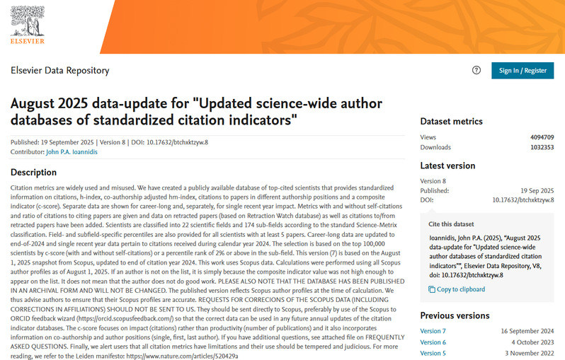 该榜单基于Scopus数据库的引用数据系统分析,以被引数、H指数、共同作者修正的Schreiber Hm-index等6项综合指标,根据“生涯影响力”和“年度影响力”从近700万名科学家中遴选出世界排名前2%的顶尖科学家,分为22个领域和174个子领域。榜单提供了面向科学家长期科研表现的衡量指标,客观真实反映科学家的学术影响力。