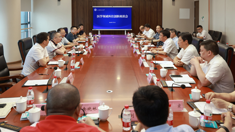 7月3日上午,学校医学领域科技创新座谈会在李白河校区11-1会议室举行,学校党委书记张力,日本生物治疗研究所副所长邓学文,川北医学院原党委书记李成军,自贡市第四人民医院党委书记章成出席会议。