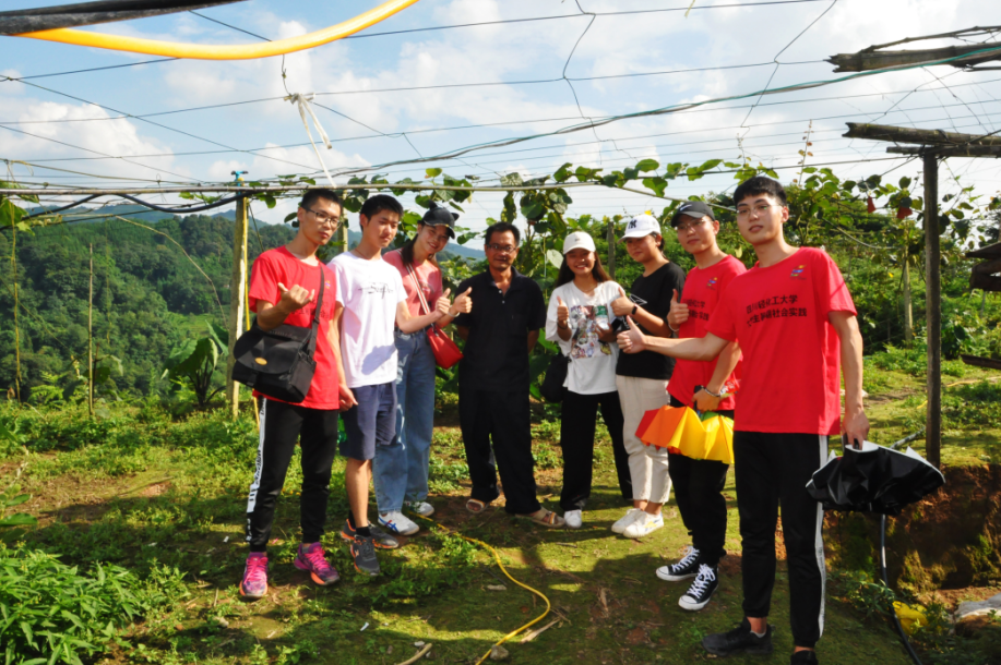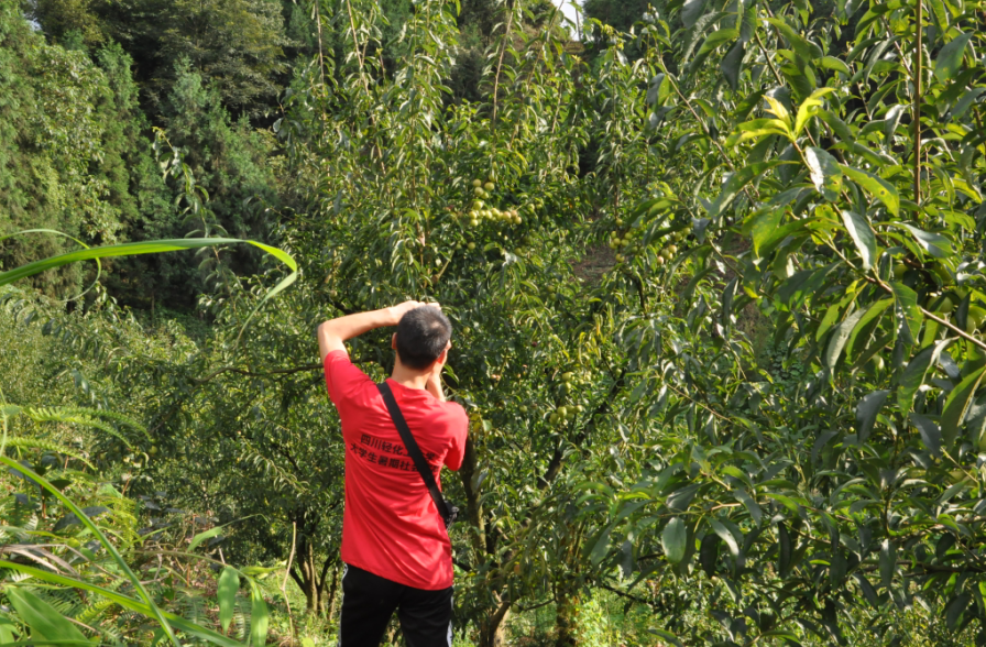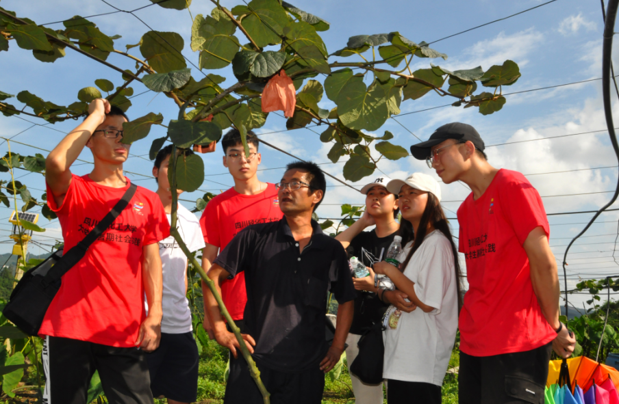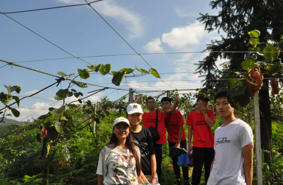 下午15:00,伴着骄阳,“向日葵之行”团队在中坝村村委会牟主任的带领下来到了中坝村“红阳”猕猴桃基地。一路上,队员们被大山的优美景象所吸引,欢声笑语中忘却了烈日的暴晒。顶着烈日,我们到达山顶,满山遍野的猕猴桃藤井然有序的生长在大山之上,我们对眼前的美景感慨万千,感慨大自然的馈赠,那藤上的猕猴桃用纸密封着,却格外诱人。在猕猴桃基地,我们还看到了中坝村特色的跑山鸡,跑山鸡外形美观,提心紧凑,尾羽高跷,它的粪便为猕猴桃藤提供营养。一路上,养殖户为我们耐心讲解了“红阳”猕猴桃种植的知识以及“红阳”猕猴桃的特点。