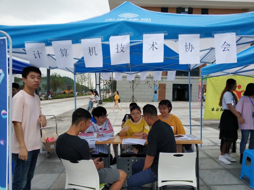 百团大战现场,各协会井然有序地进行着招新工作,来往的不同衣着的同学们形形色色,随处可见欢声笑语,形成了一幅洋溢着青春气息的画卷,体现出了各社团的和谐积极的良好风貌。在计算机技术协会的营帐前,宣传人员很卖力的“吆喝”,吸引不少学生,很多对计算机相关知识感兴趣的同学特地赶来,计协的工作人员积极地为前来咨询的同学讲解,期间也有外国留学生前来了解,协会工作人员也能从容应对,耐心交流,他们的一举一动都体现着计协人的风采。