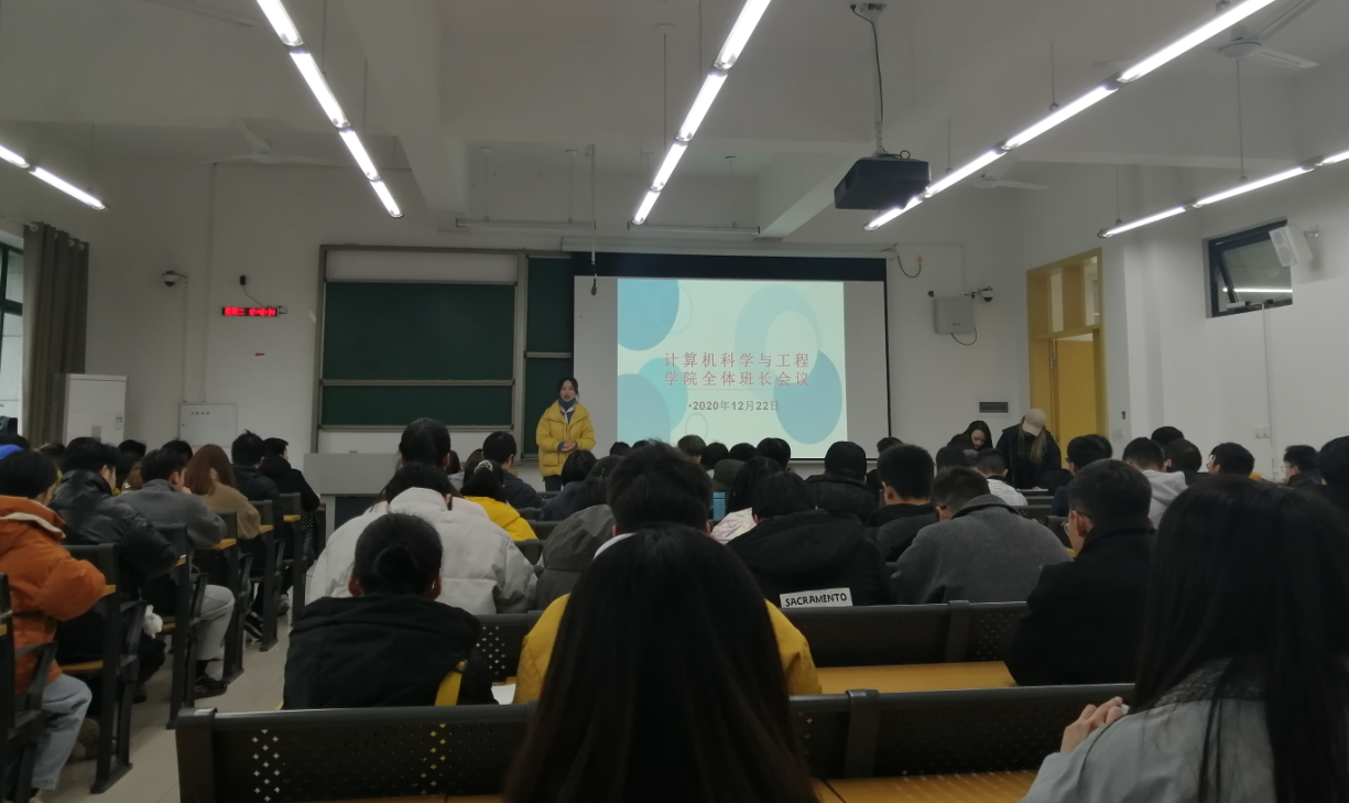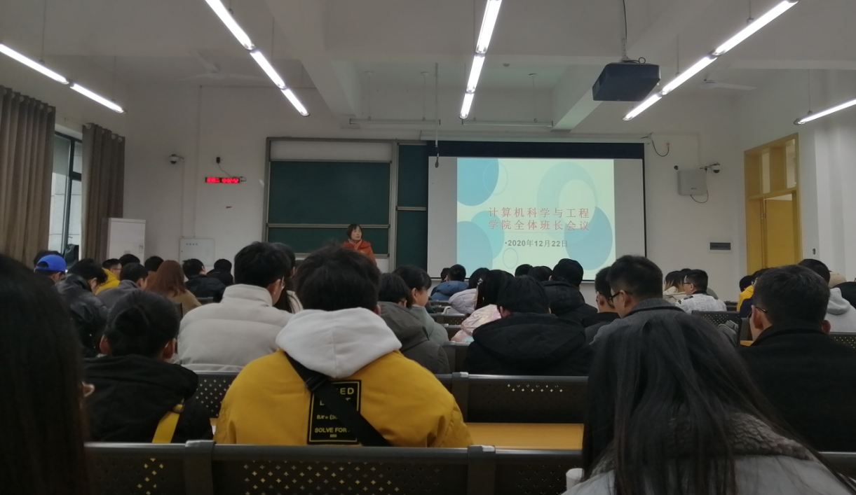 12月22日下午12:50分,计算机科学与工程学院在宜宾校区A5-226教室召开学院全体班长会议,学院党总支副书记何洪英、学工办临时负责人何芬、辅导员陈茂礼以及84名班长参会。