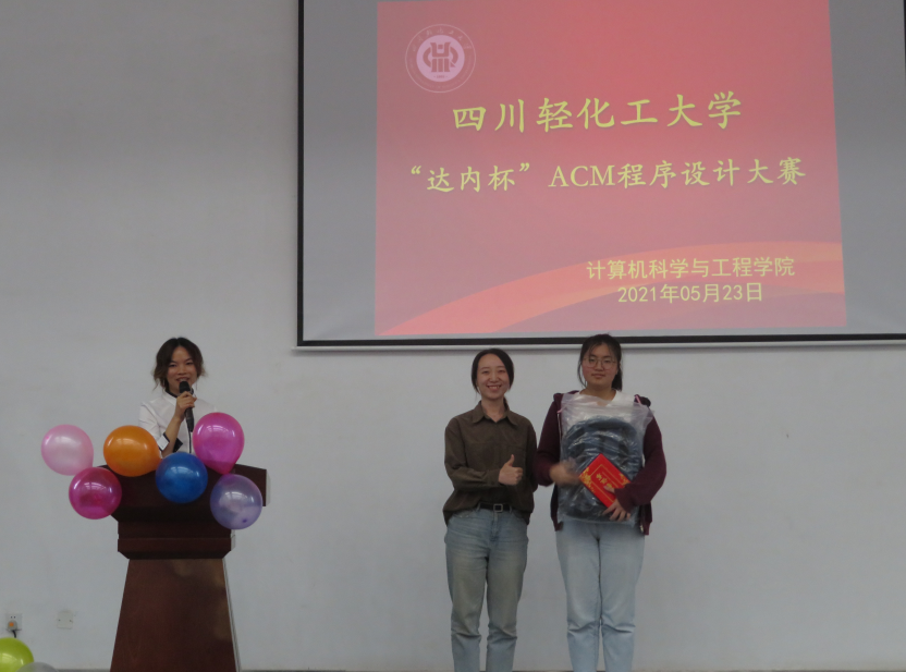 本次比赛分共有六个考场,采用机考的方式,选手们根据自身情况选择相应的题目进行答题,内容以考察算法的基本思想及运用为主,包含了数学、全排列、规律推算等知识,涉及的内容面广且繁琐,对参赛选手的知识储备能力、思考能力和团队协作能力有较高的要求。比赛开始,每组选手通力合作,在经过缜密的思考后,一人敲代码,一人继续思考,配合默契。选手每做出一道题,志愿者们就为选手们送上一个气球。经过四个小时的激烈角逐,共有35组选手完成了不同数量题目的解答。本次比赛评选出一等奖5名、二等奖10名、三等奖20名,最佳女队奖和顽强拼搏奖。赛后在A6-221学术报告厅举行颁奖仪式,颁奖仪式由学工办何芬主持,学生处老师苏欣宇、学院党委副书记兼纪委书记何洪英、学院副院长曹立佳、学院创新创业中心主任何海涛为获奖选手颁奖。曹立佳对本次比赛做出点评,他对选手们的优异表现给予肯定,对组织参与本次赛事的师生的辛勤劳动给予肯定。