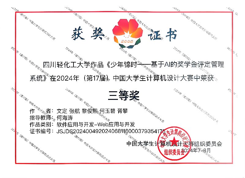 7月22日至25日,由中国大学生计算机设计大赛组织委员会主办、山东大学和北京语言大学承办的2024年(第17届)中国大学生计算机设计大赛“软件应用与开发类”作品决赛在山东大学威海校区举行。我院何海涛老师指导的计科2021级文定、张航等5名学生的团队作品《少年锦时——基于AI的奖学评定管理系统》从422所高校、647件参赛作品,近2700名参赛队员中脱颖而出,喜获三等奖。