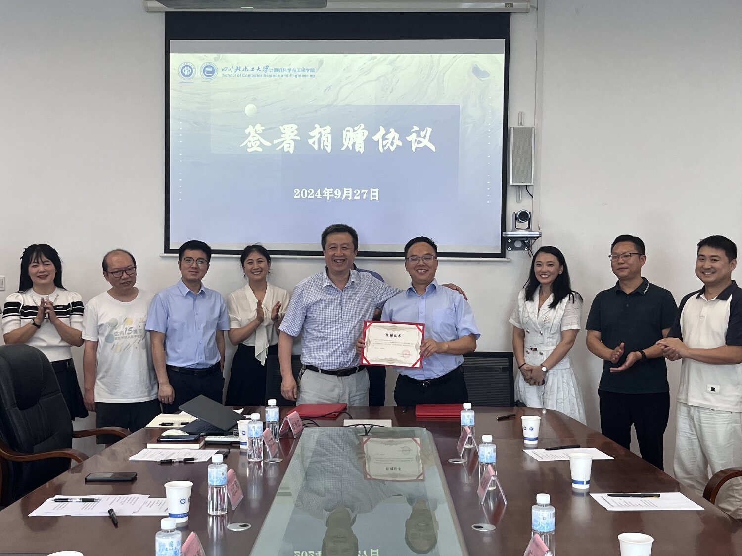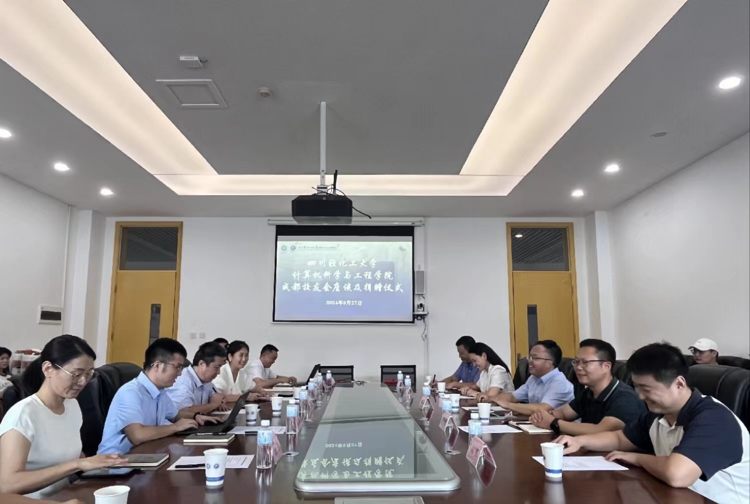 9月27日,计算机科学与工程学院在宜宾校区A6-521举行校友座谈暨捐赠仪式。校友代表反哺母校,助力学校教育事业发展。计算机学院成都校友会会长、2001级网络工程专业校友、中科曙光信息产业成都有限公司副总经理旷永东,计算机学院成都校友会秘书长、2005级计科专业校友、成都一久进出口贸易有限公司国内事务负责人屈红艳,计算机学院成都校友会副会长、2002级网络工程专业校友、四川数智信安科技有限公司总经理吕波,计算机学院成都校友会副会长、2002级网络工程专业校友、微眼科技(成都)有限公司总经理郑义富,计算机学院成都校友会计科专业2010级校友、成都微上行科技有限公司总经理谢勇,学院领导班子及师生代表参加座谈暨捐赠仪式。