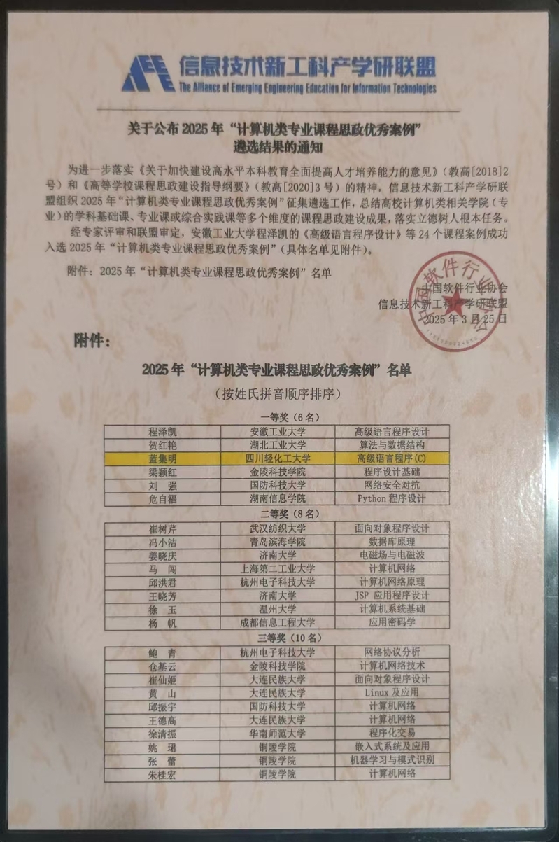 本次大会以“落实产出导向,深化课程思政,落实计算机类人才培养立德树人”为主题,邀请了国家万人计划教学名师蒋宗礼教授、湖北省教学名师秦磊华教授、浙江省万人计划教学名师施晓秋教授出席会议并做了主题报告。大会组织专家对来自全国各个高校择优推荐出来的课程思政优秀案例进行了严格的评审,最终发布了2025年“计算机类专业课程思政优秀案例”一等奖6名,二等奖8名,三等奖10名。我校网络工程专业蓝集明副教授牵头的《高级语言程序(C)》课程,荣获了计算机类专业课程思政优秀案例一等奖。