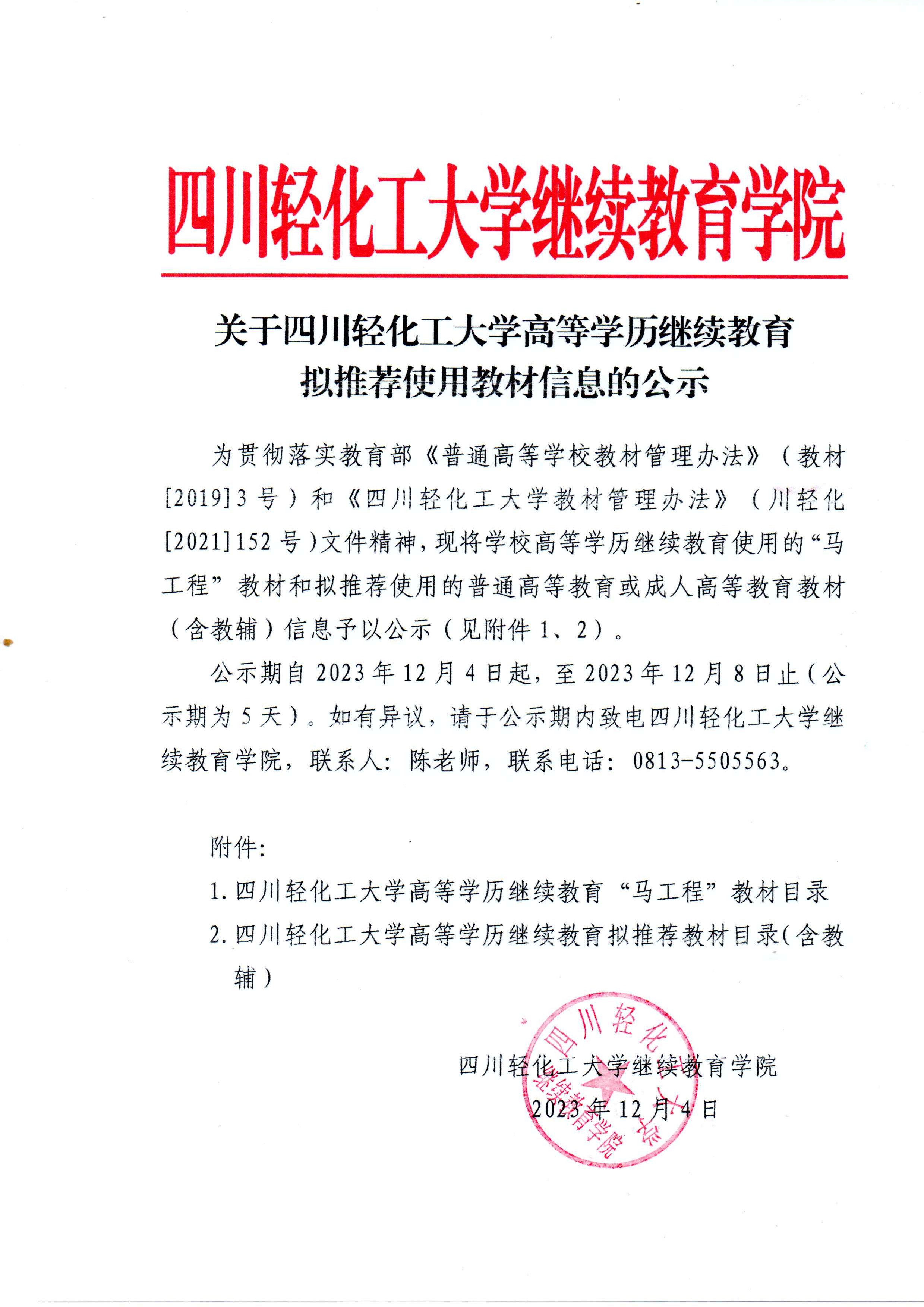 关于四川轻化工大学高等学历继续教育拟推荐使用教材信息的公示