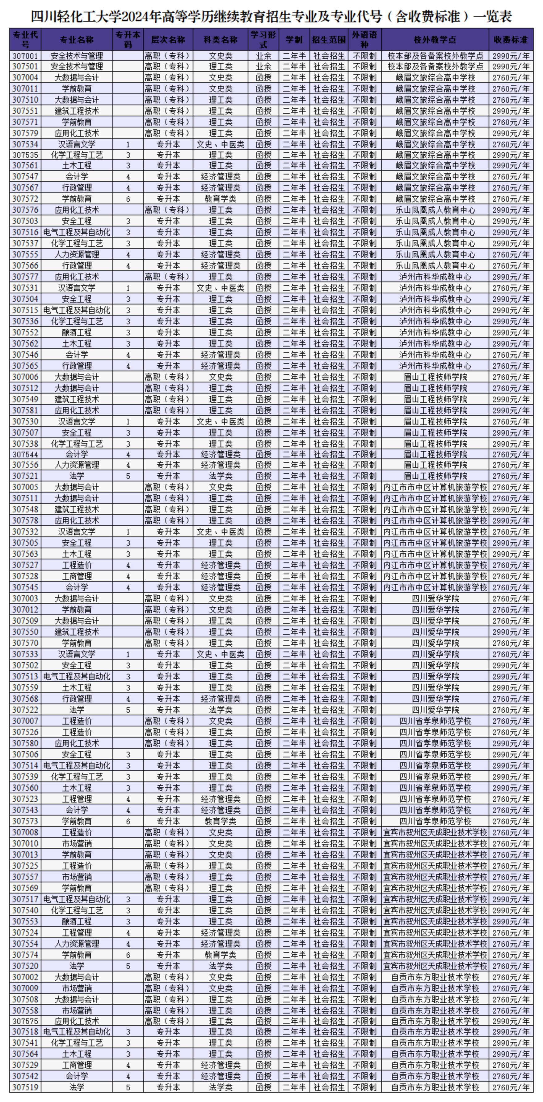 四川轻化工大学2024年高等学历继续教育招生专业及专业代号(含收费标准)一览表