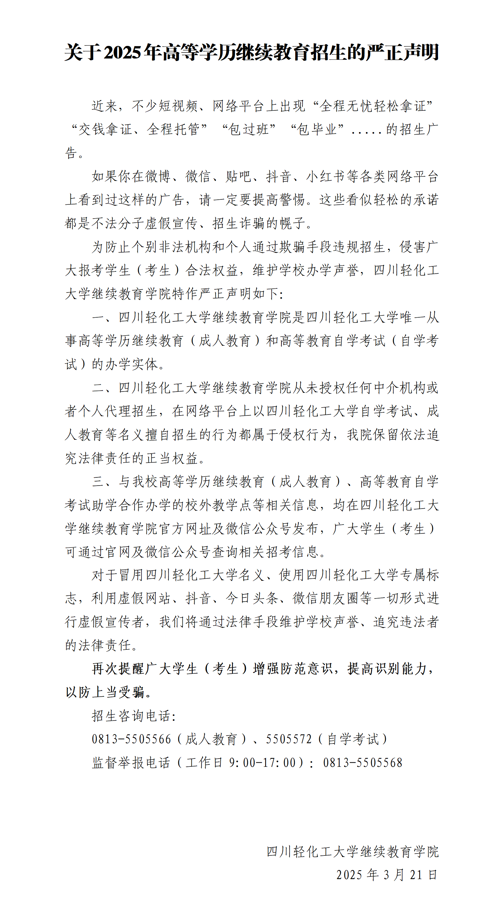 关于2025年高等学历继续教育招生的严正声明