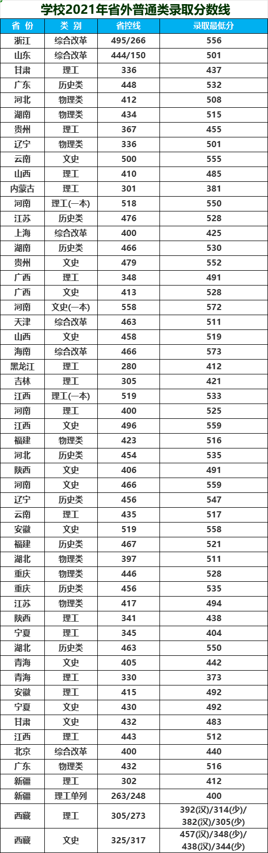 学校2021年省外普通类录取分数线