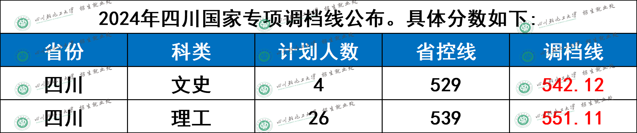 四川轻化工大学2024年四川国家专项调档分数线