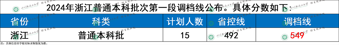 四川轻化工大学2024年浙江普通本科批次第一段调档分数线