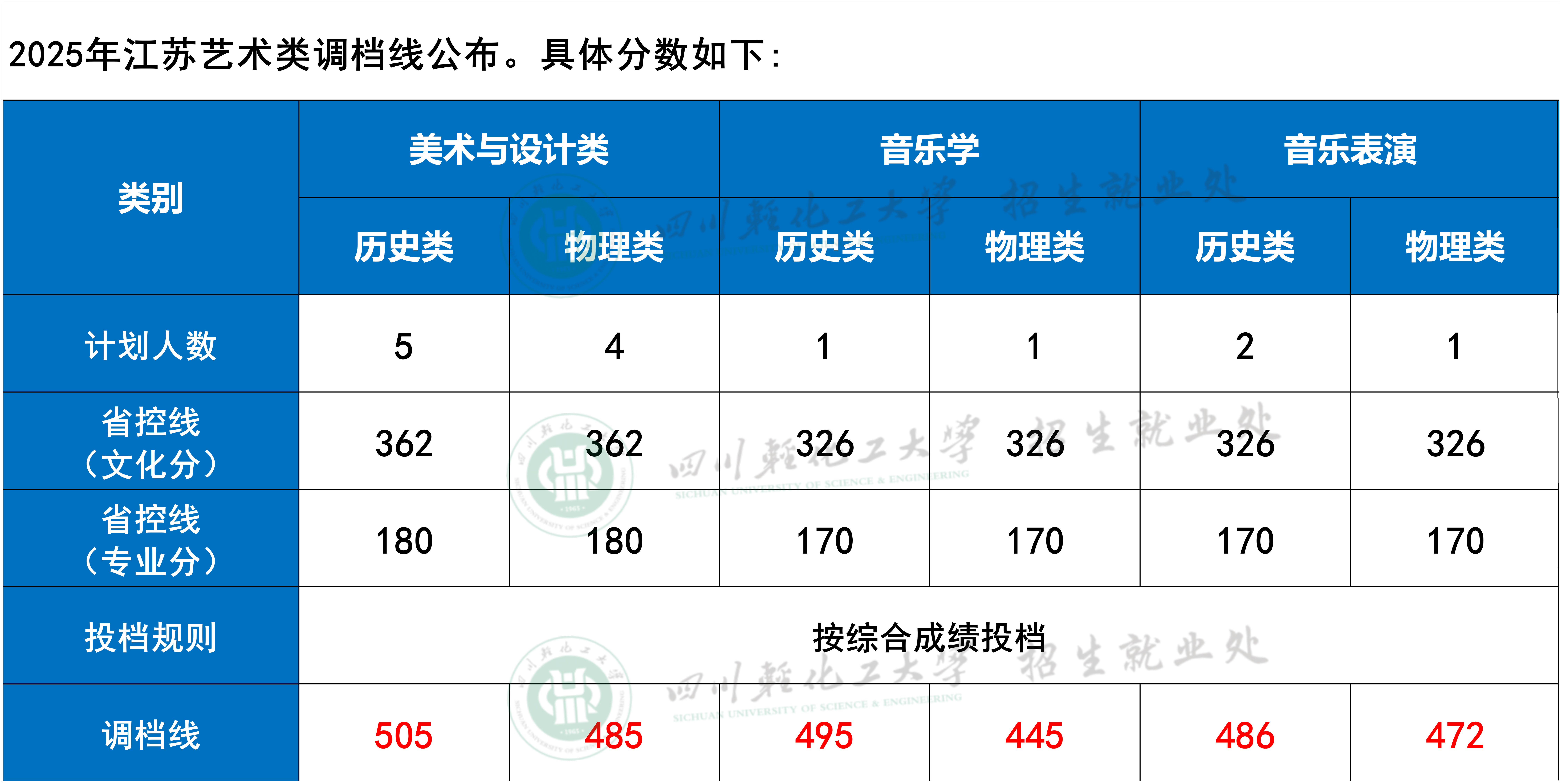 四川轻化工大学2025年江苏艺术类调档分数线公布