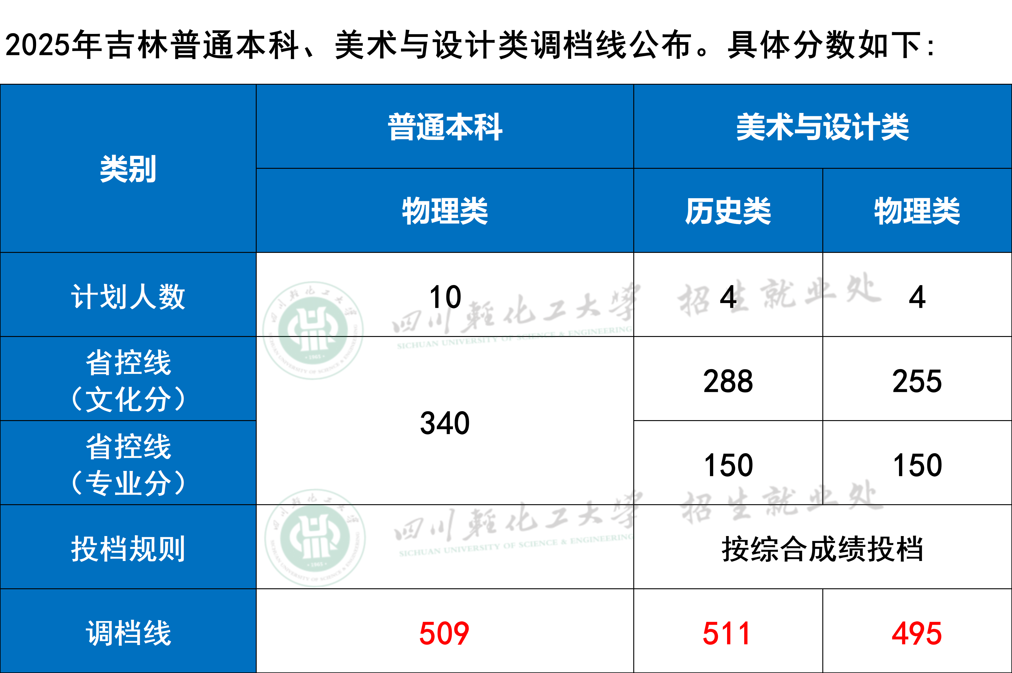 四川轻化工大学2025年吉林普通本科、美术与设计类调档分数线公布