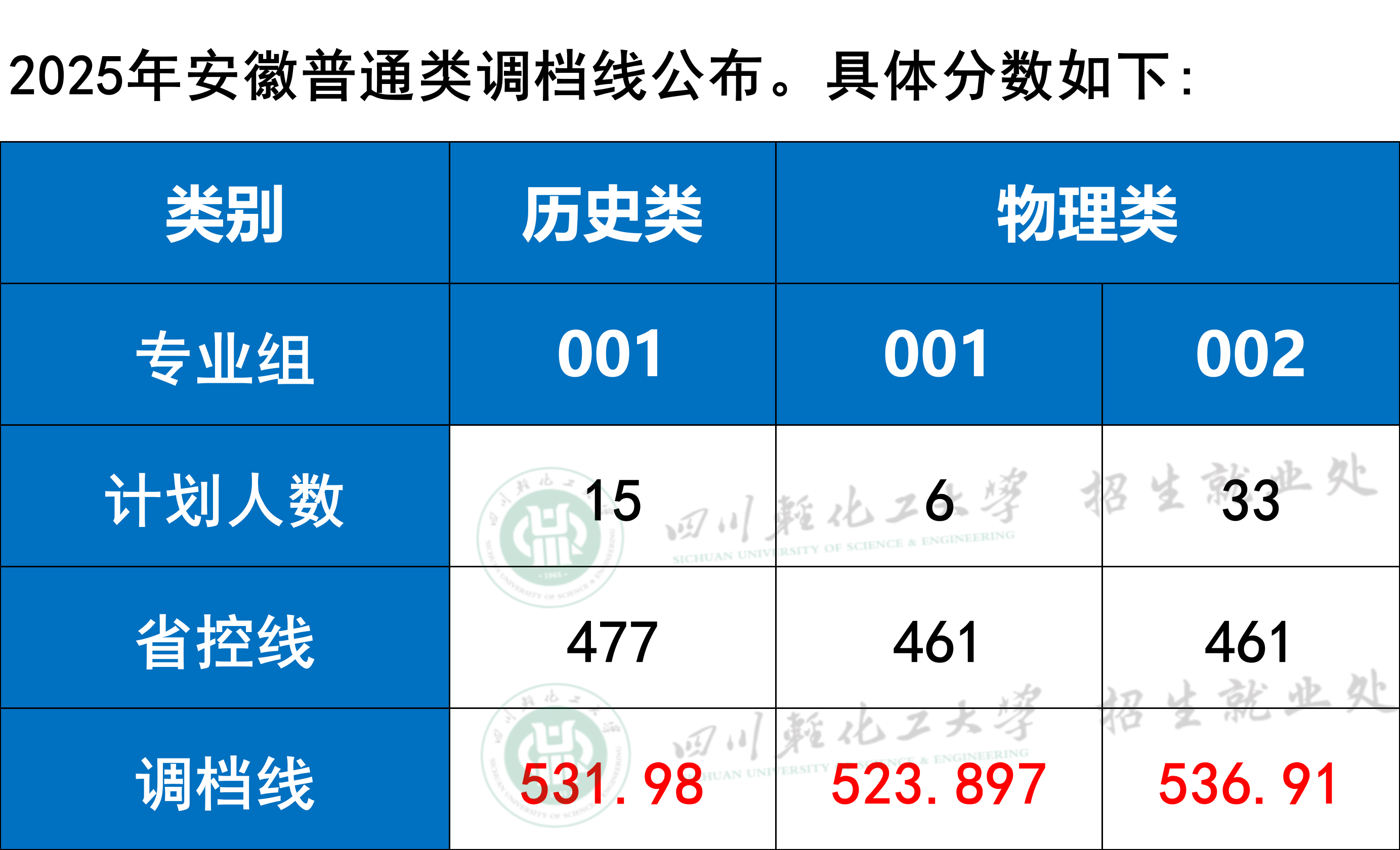 四川轻化工大学2025年安徽普通类调档线公布