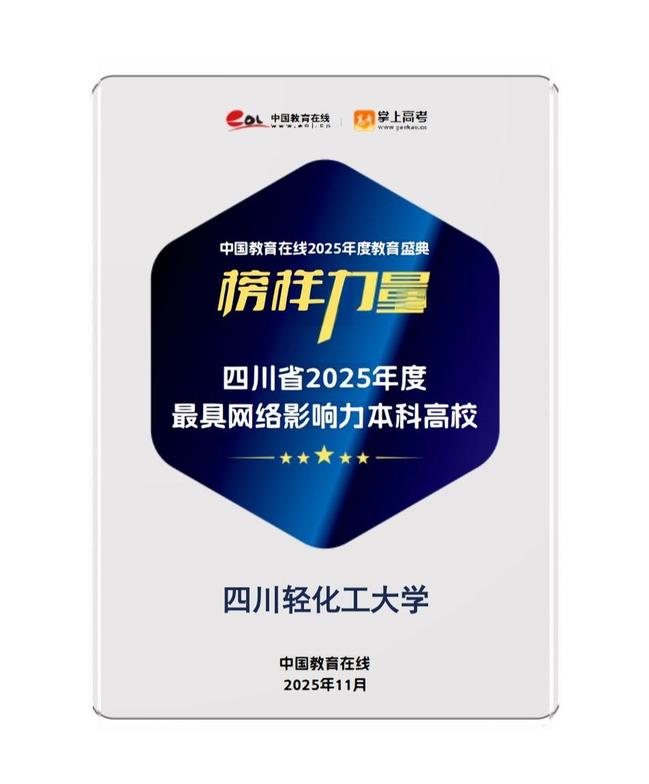 “先进集体”称号由四川省高等教育招生考试委员会评定,我校刘自山、刘红同时荣获“先进个人”称号。另一奖项来自中国教育在线“榜样力量·2025年度教育盛典”,旨在表彰高校在网络宣传与数字化招生方面的突出表现,评审综合考察了各校运用网络平台、数字技术进行精准推广的能力,以及大数据分析与整合传播的实效。
