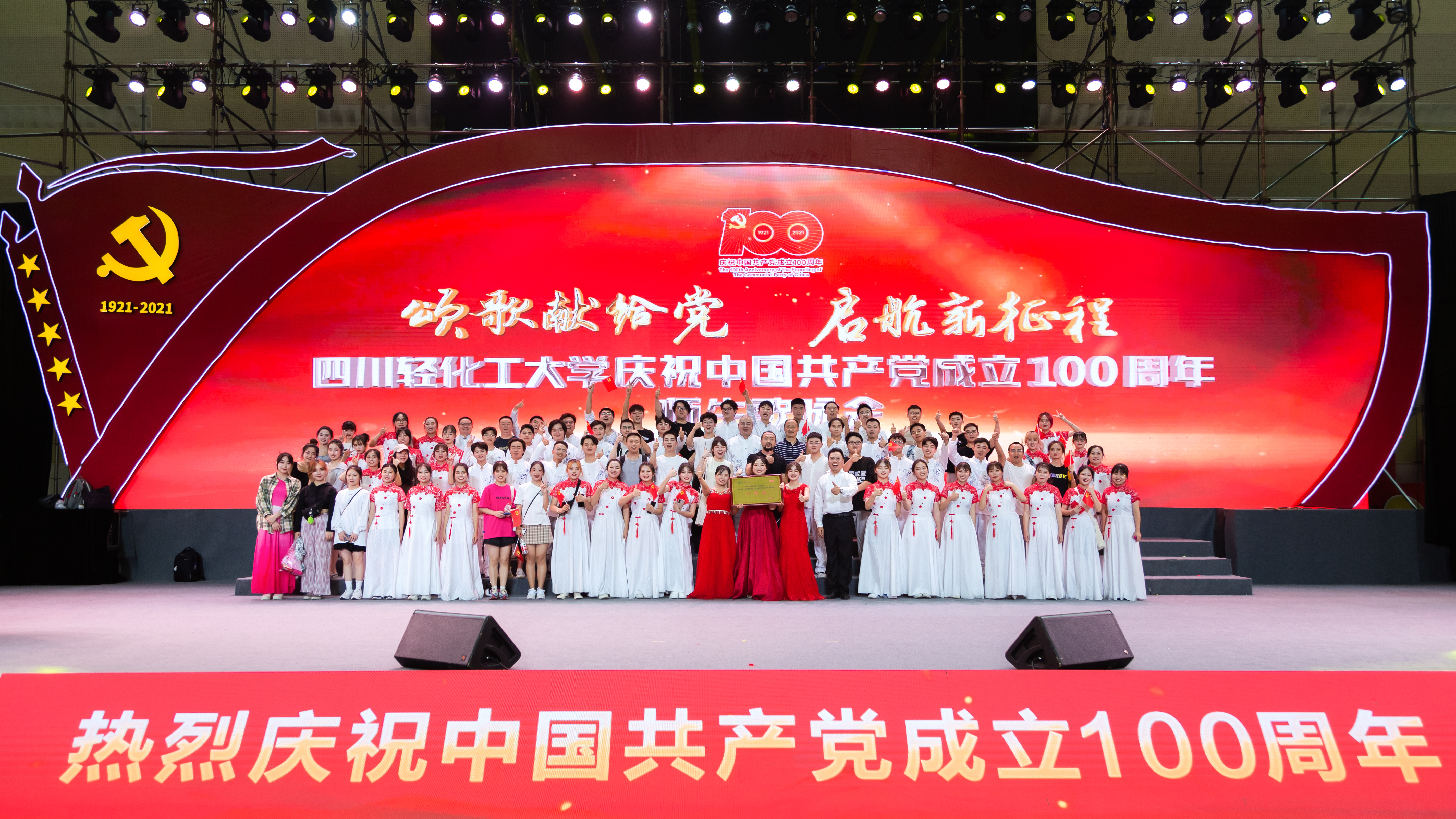 百年征程波澜壮阔,百年初心历久弥坚,百年党史催人奋进。在举国上下隆重庆祝伟大的中国共产党成立100周年之际,为引领和凝聚广大师生学党史、知党恩,不忘初心跟党走,6月30日,我校“颂歌献给党 启航新征程”庆祝中国共产党成立100周年师生歌咏会在自贡李白河校区体育馆隆重举行,来自全校的24支队伍参加了此次歌咏会。我院100余名师生在歌咏会第三篇章《翻天覆地》共同演唱《希望的田野上》,歌声嘹亮通透,悦耳动听,展现了中国共产党在改革开放和社会主义现代化建设新时期,中国农村发生了翻天覆地的变化,农民生活水平显著提高,喜获丰收的喜悦情景。美术学院最终获得了师生歌咏会一等奖的喜人成绩,以优异的成绩献礼党的百年华诞。
