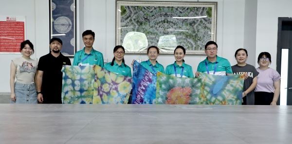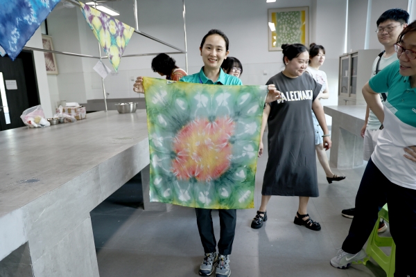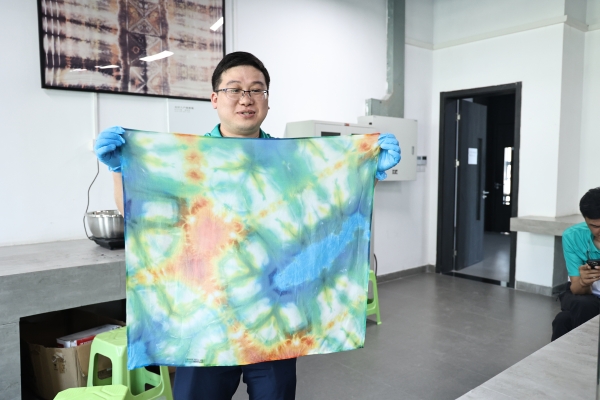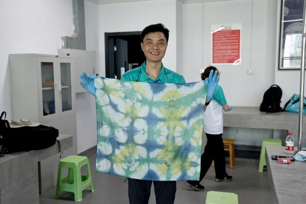 美术学院院长黄磊陪同参观交流。服装设计教研室主任文静和视觉传达设计教研室唐蛟博士简要介绍了自贡扎染的发展历史、传承现状、艺术特色及制作过程,并协助领导们制作扎染方巾。领导们在体验后认为扎染制作非常有趣,由自己双手完成的作品仅此一件、独一无二,无疑具有特殊魅力。