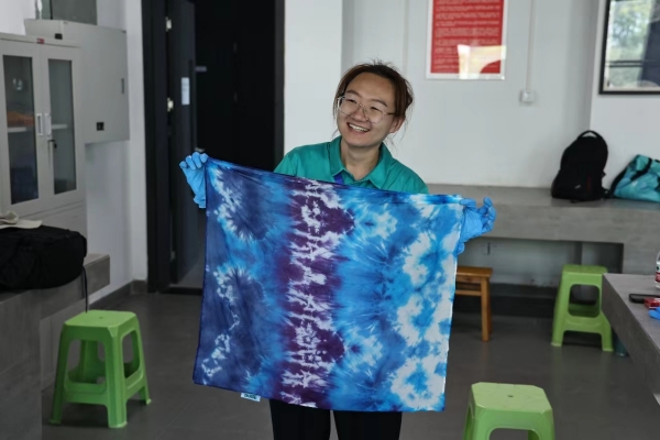 大网赛举办期间,在参加总决赛的197所高校选手中共有15名运动员恰逢生日。美术学院师生团队紧急加班,为15名运动员专门设计、制作了扎染方巾,作为学校官方礼物赠送运动员。扎染方巾深受运动员们的喜爱,获得大体协和大网协领导高度赞誉,收获了参赛高校的一致认可。一张扎染丝巾不仅是一份礼物,也是了解和认识自贡扎染非遗技艺的窗口,通过这扇窗口可以领略异彩纷呈的自贡地方文化。