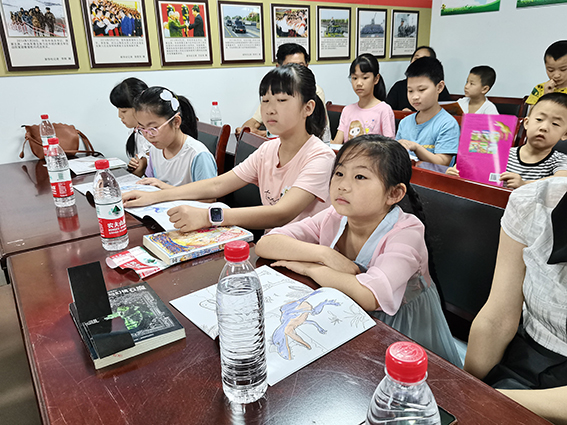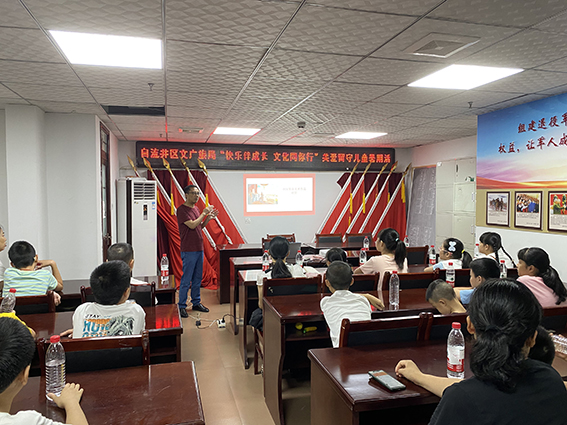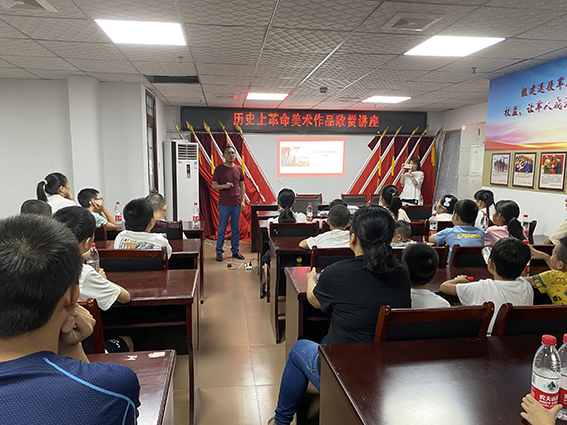 本次送文化活动共两项内容,第一项为梁川主讲《中国革命美术作品欣赏》公益讲座。依据历史事件发生的时间顺序,通过《五四运动》(周令钊作)《启航》(何红舟、黄发祥作)《南昌起义》(黎冰鸿作)《秋收起义》(何孔德、高泉、冀晓秋、陈玉先作)等经典美术作品图片,梁川分别向参加活动的小朋友们讲解了“五四运动”“中国共产党一大”“南昌起义”“秋收起义”“西安事变”“侵华日军投降”“渡江战役”“中华人民共和国建国典礼”等历史革命故事。在讲座过程中,梁川通过与小朋友之间的积极互动,尽量使参与者了解中国共产党和人民军队的光辉历程。