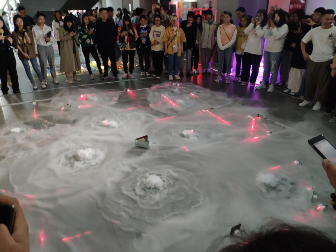 在教学实践中,首先是对光艺术理论的梳理,从远古时期、近世概况、现代之变到当代演进,让同学们了解从古到今光影艺术的流变过程,其次是对现代主义以来的优秀艺术个案进行分析研究,最后通过对不同的光学现象的探索以及自身动手实践创作,融入了对当下的反思和对未来的想象。在整个教学过程提升了学生的创作思维能力使他们掌握了创意构思的设计方法增强了对不同材料和工艺的把控能力,也锻炼了动手实操能力。从最初的灵感发想到创作成果的转化,最终落地到展览展陈空间,达到了本课程的教学预期。同学们也是首次尝试以艺术装置的形式来发挥自身专业特色,在不到一个月的时间里,彩灯班32位同学合作完成了《关于光About Light》新媒体影像作品及20余件光影装置作品,在开幕式现场取得了热烈的反响,呈现出我们新时代的“彩灯”风采,可谓不忘过去的理想,又以开放的姿态迎接未来,对于我校培育符合社会需求的复合型人才具有前瞻性和战略意义。