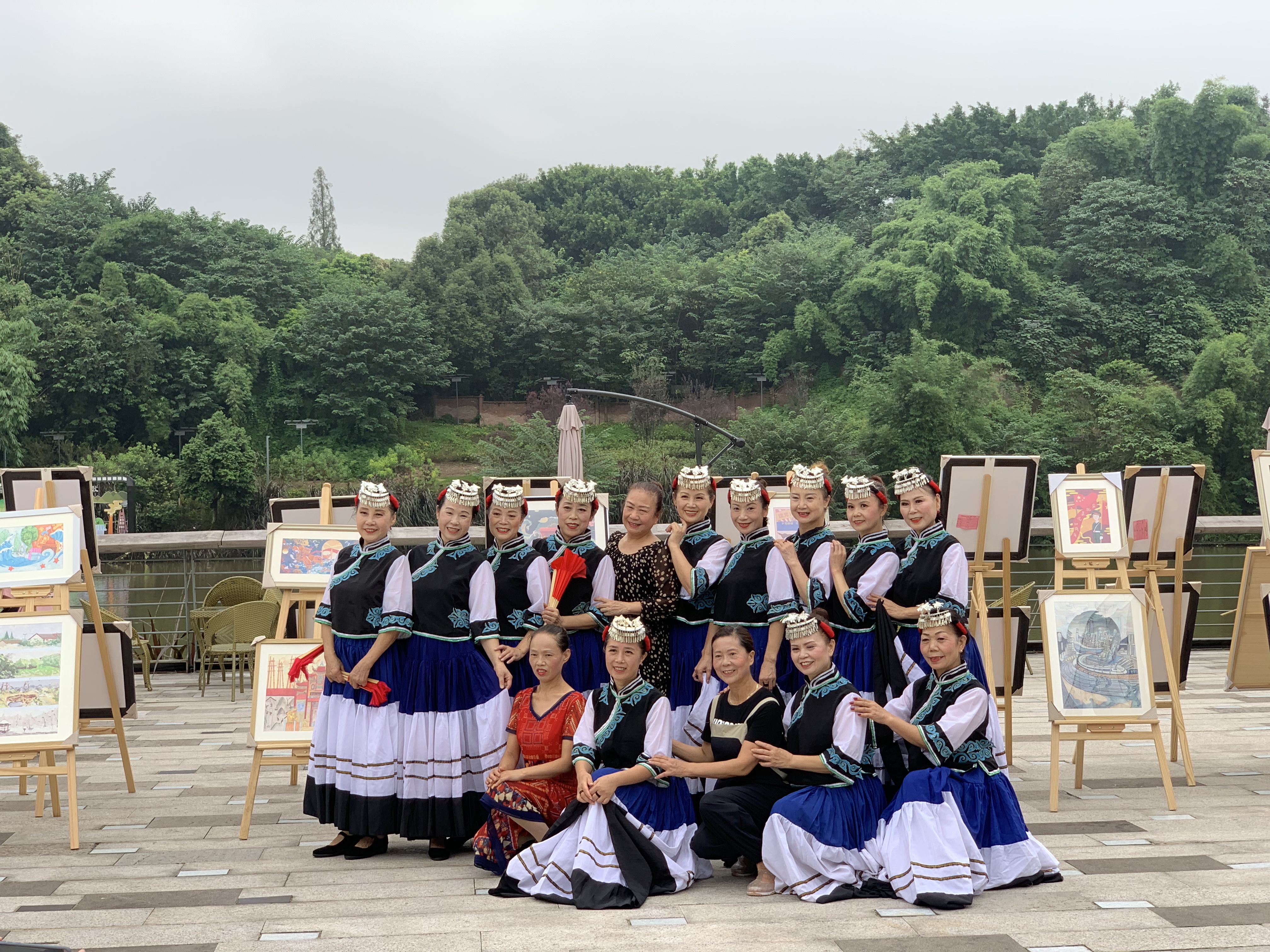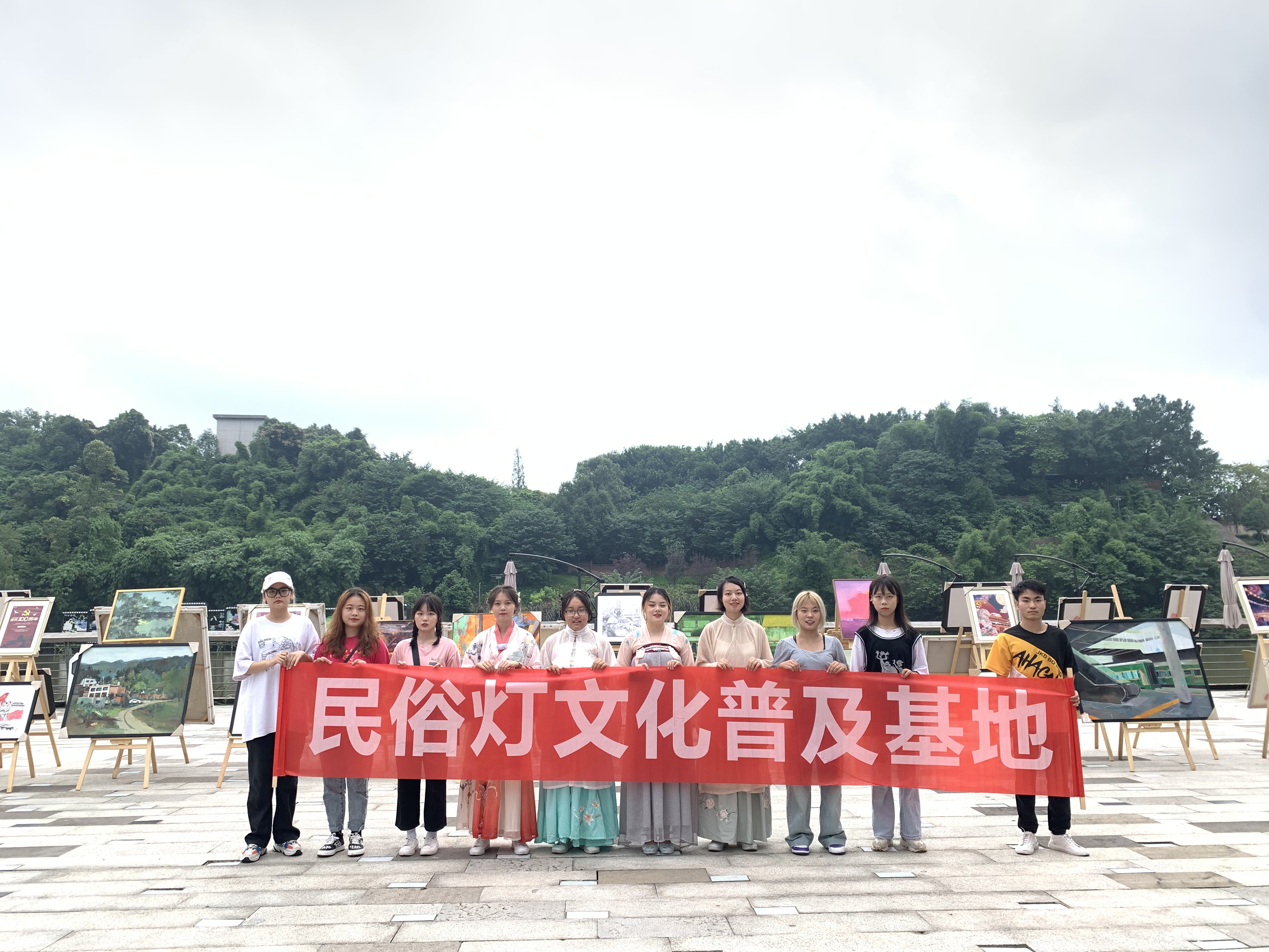 为进一步营造自流井区传统文化范围,不断活跃自流井老街文化气象,2021年9月24日上午,彩灯设计与文化传播协会的大学生志愿者们前往自流井区毛家社区坝釜溪文创公园组织开展“庆祝中国共产党成立100周年美术作品展”活动。出于强化现场文化气氛需要,部分志愿者身着汉服,以特别的人文景观助力地方政府申报省级休闲街区。10点30分画展布置完毕,随即开始聚集着人气,引来不少市民驻足欣赏。